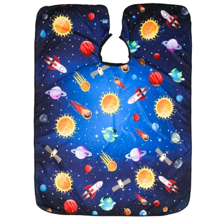 Verwandeln Sie einen Friseurbesuch in eine faszinierende Reise ins Weltall! Friseurumhang für Kinder mit buntem Galaxienmotiv macht jeder Haarschnitt eine Menge Spaß. Mit einem dynamischen Design voller Raketen, Planeten und Sterne fühlen sich die kleinen Kunden wie echte Weltraumforscher!